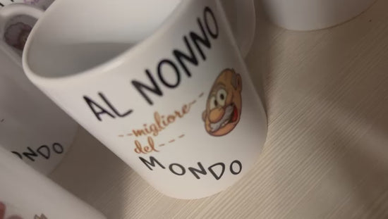 Immagina una tazza personalizzata per la festa dei nonni, pensata per essere un regalo dolce e affettuoso. Potrebbe avere una base bianca o in un colore pastello caldo, come il crema o il celeste, per un tocco delicato.